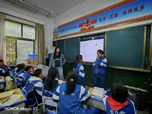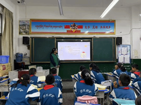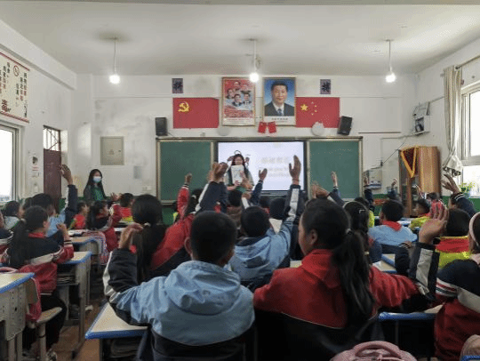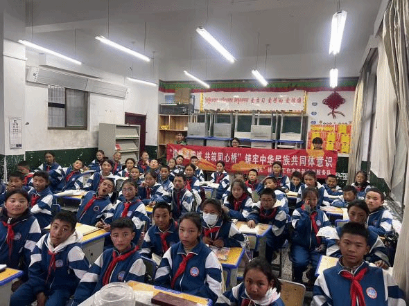 实践团成员以“说好普通话,共筑同心圆”为主题,进行了生动的演讲:“普通话,它就像一把神奇的钥匙,能够打开我们与全国各民族小朋友交流的大门。”志愿者结合自己的亲身经历,用孩子们易于理解的语言,深入浅出地阐述了普通话的重要性,还用普通话讲述了藏族民间故事《阿古顿巴的故事》。现场,志愿者示范了“四是四,十是十”等绕口令,孩子们纷纷跟着小声模仿,原本略显拘谨的课堂瞬间变得生动活泼起来。演讲结束后,志愿者邀请学生们分享自己对普通话和民族团结的理解。“我觉得普通话很重要,因为它能让我们和全国各地的小朋友成为好朋友。”三年级的学生扎西举手发言,他的眼中闪烁着对未来的憧憬。另一位学生次仁则说:“我们要像石榴籽一样紧紧抱在一起,用普通话传递爱和温暖。”