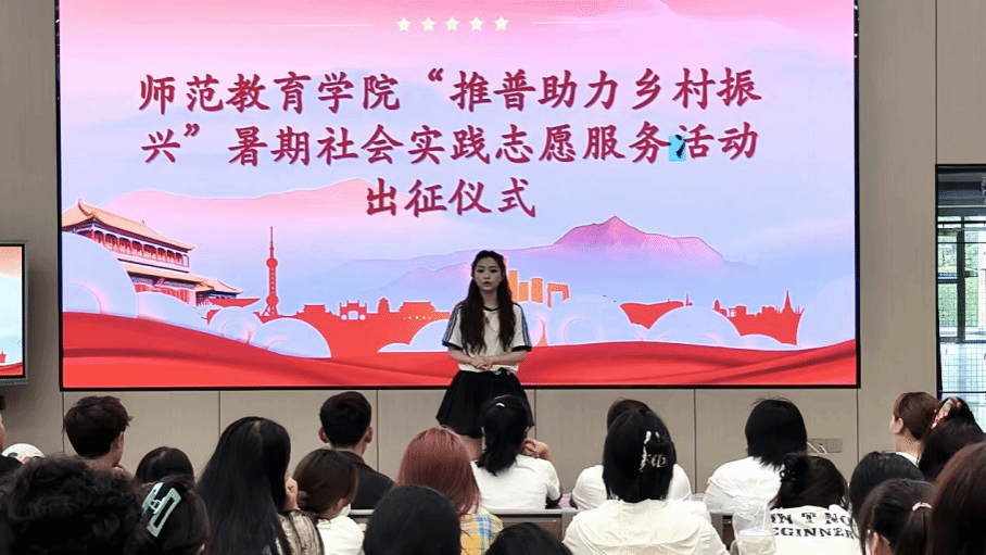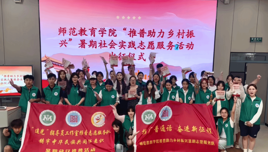 2025年,正值西藏自治区成立60周年。为深入贯彻落实习近平总书记关于教育的重要论述和关于语言文字工作的重要指示批示精神,铸牢中华民族共同体意识,师范教育学院于暑假前在行知楼南合教室举行“推普助力乡村振兴”社会实践志愿服务出征仪式。党团联动“追光”辅导员工作室藏区推普实践团及乡村地区推普实践团两支队伍全体师生齐聚一堂,共同开启这场意义非凡的推普之旅。