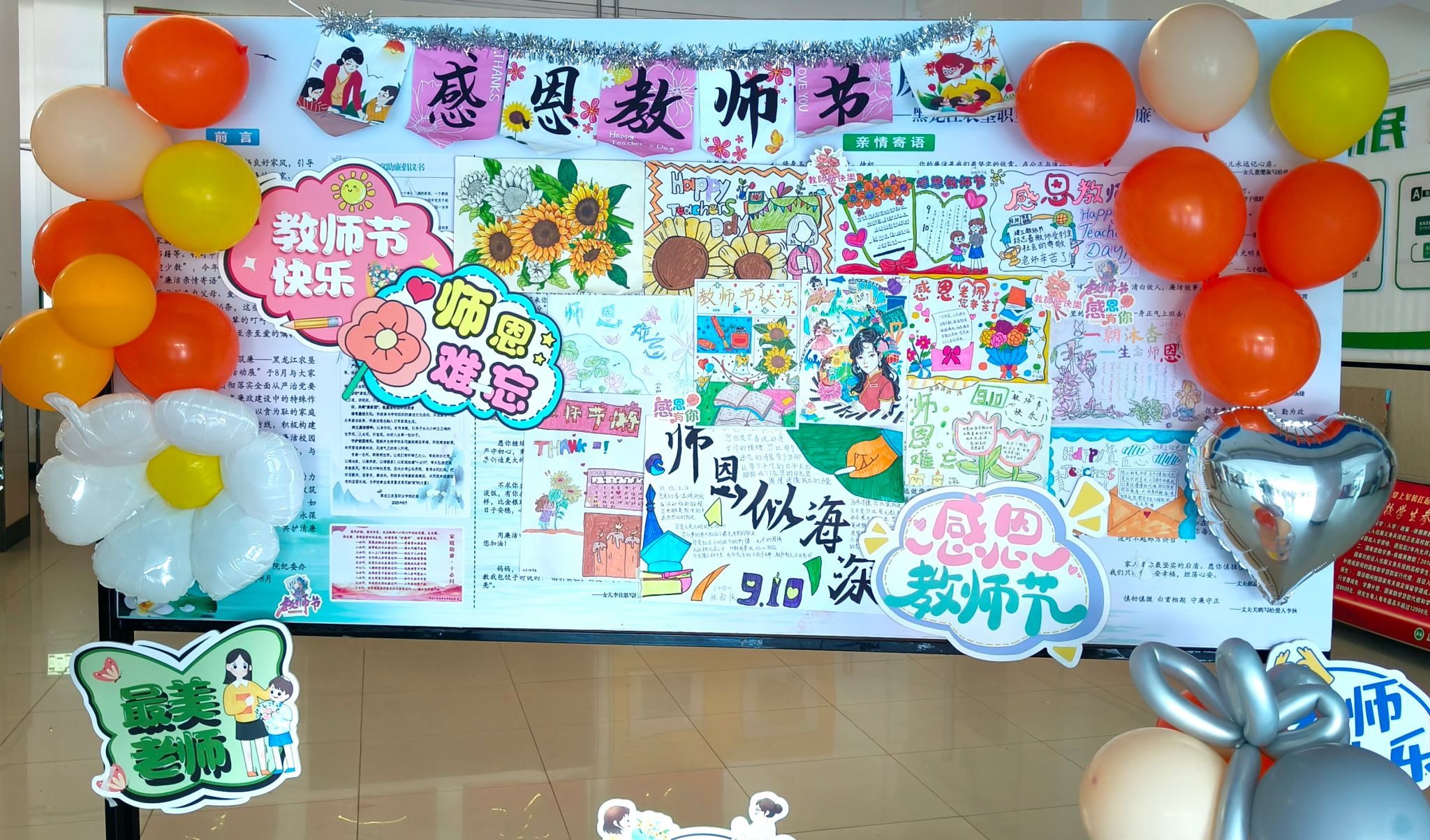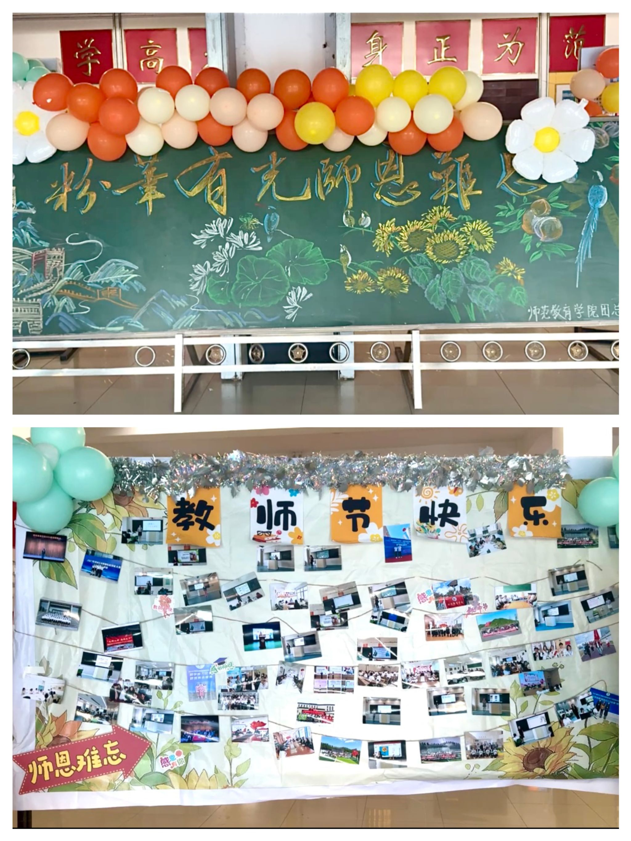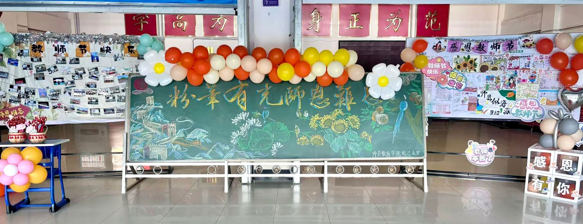 走进一楼大厅,浓厚的教师节氛围扑面而来。现场以橙、黄两色为主题,象征着老师如阳光般照亮学子的前程。最引人注目的是那面“师者风华”照片墙,定格了师生互动的生动瞬间与教师备课的专注身影。这些由学生们记录下的照片,是老师们日常辛勤工作的缩影,每一张背后都是学子们深深的感激与铭记。