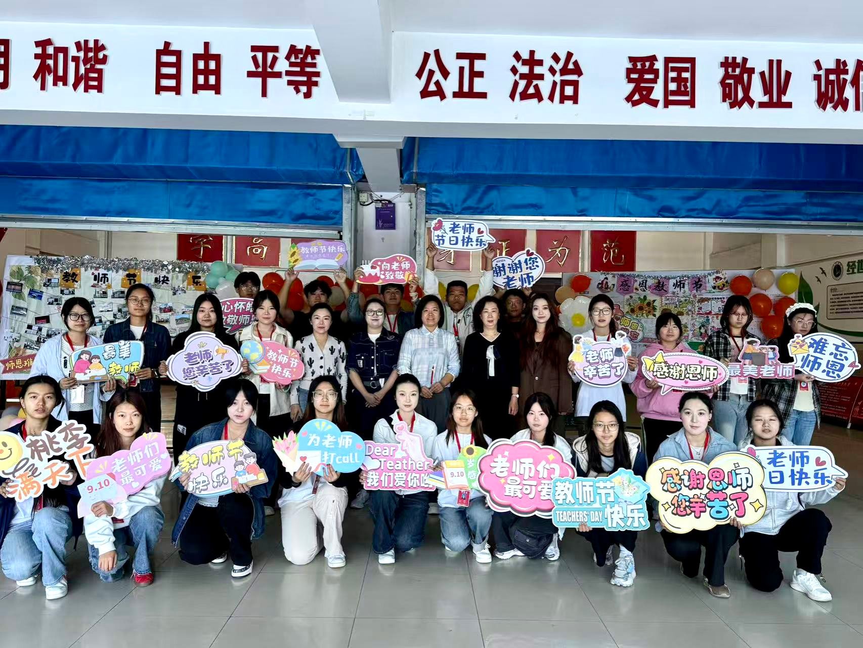 9 月 9 日晚,当暮色漫过校园,师范教育学院教学楼的灯光却格外明亮。一楼大厅里,学子们正忙着布置惊喜现场的剪影,成为了校园里最动人的夜景。9月10日清晨,第一缕阳光掠过教学楼檐角,师范教育学院学子早已守候在一楼大厅——他们手持“教师节快乐”、“师恩如海”的手牌分列两排,用一声声“老师,您辛苦了!”迎接每一位踏光而来的教师。将前一晚月光下的满心期许,化作了清晨最温暖的礼赞。
