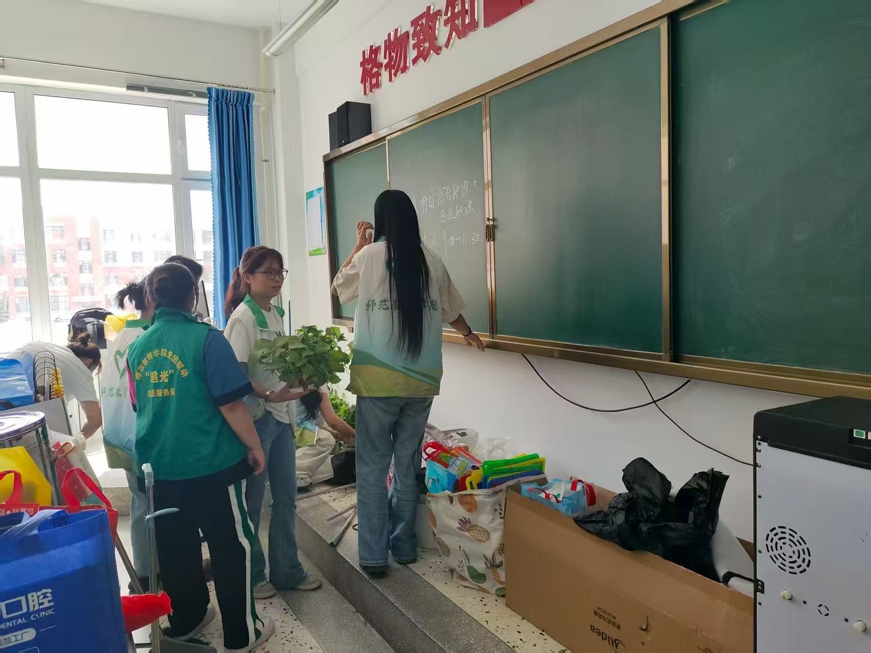 活动中,志愿者们结合专业学习中掌握的教材梳理方法,与第二小学教师共同制定了 “按年级分类-按单元排序” 的教材分发方案。他们不仅高效完成了 1-6 年级教材的清点、核对与分装工作,还针对低年级课本进行了圆角包边处理,用课堂上学到的 “儿童本位” 理念呵护学生成长。从课桌椅的规范摆放,到绿植的科学养护;从教学设备的调试检查,到校园环境的清洁整理,志愿者们用专业素养解决了学校开学前的多项实际需求。第二小学老师在感谢中特别提到:“师范学子的服务既有‘接地气’的实干劲头,更有‘懂教育’的专业思考,这让我们看到了未来教育工作者的责任与担当。”