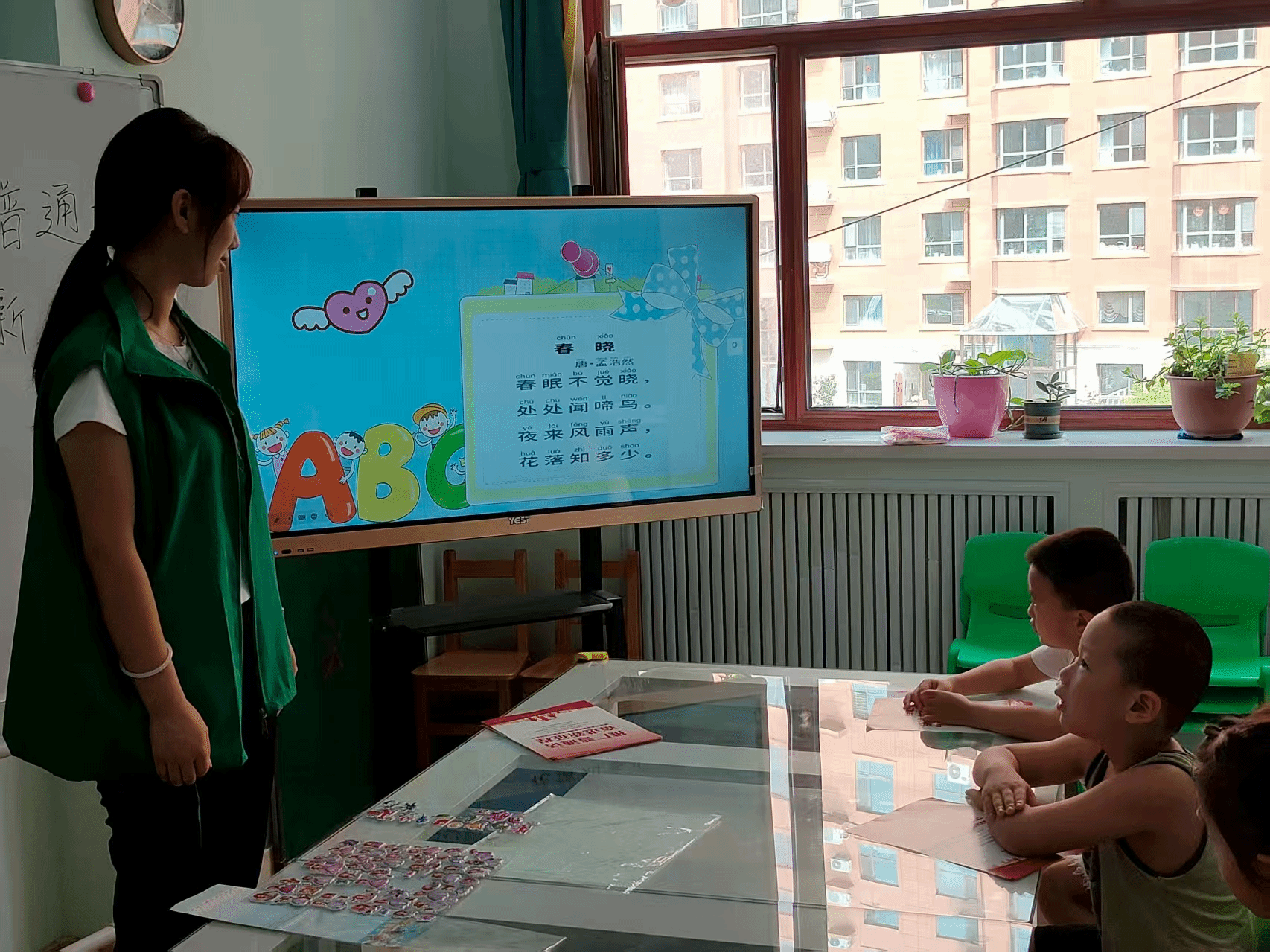 考虑到孩子对乡音的熟悉度,团队特别设计“双语故事会”—— 先用地道的东北话讲《小松鼠找松果》《小熊的新朋友》等童趣故事,让孩子在熟悉的语境里走进情节;故事讲完后,志愿者再用普通话逐段复述,引导孩子跟着模仿角色对话。活动结束时,不少孩子主动举手,用普通话分享“我喜欢小熊” 的故事片段,乡音的亲切在故事中悄然升华。