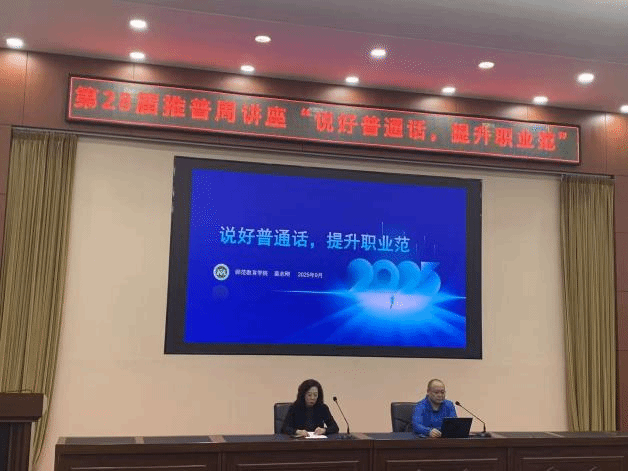 为扎实推进第28届推广普通话活动周工作,引导广大师生进一步增强规范使用国家通用语言文字的自觉性,弘扬中华优秀传统文化,促进铸牢中华民族共同体意识。我校积极响应、精心组织,于2025年9月17日下午在育才楼多功能厅成功举办“说好普通话,提升职业范儿”主题讲座,为校园语言文化建设注入了新的活力。