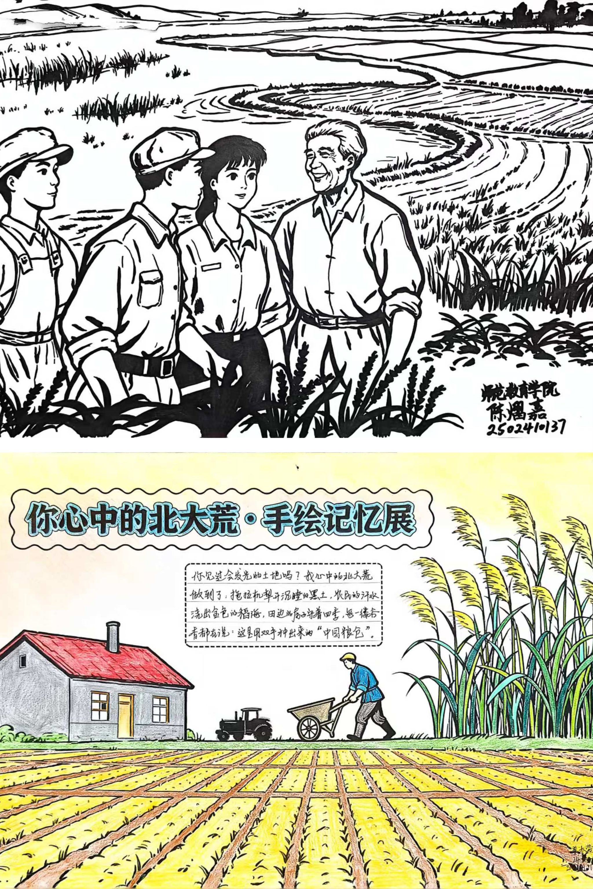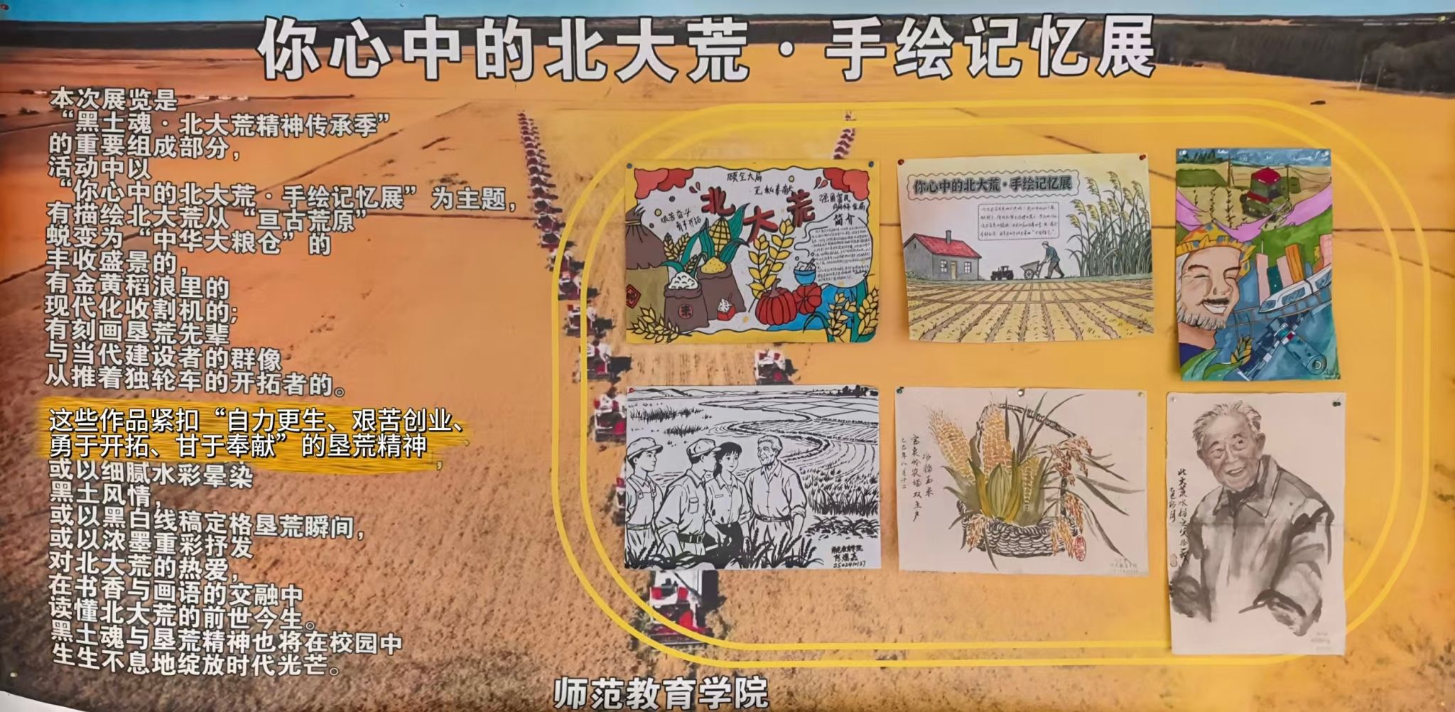 10月22日,师范教育学院在行知楼一楼大厅启动“黑土魂·北大荒精神传承季”系列活动之“你心中的北大荒·手绘记忆展”。百余名学子以笔为犁,用近百幅手绘作品再现亘古荒原变身“中华大粮仓”的沧桑巨变,向一代代拓荒者致敬。