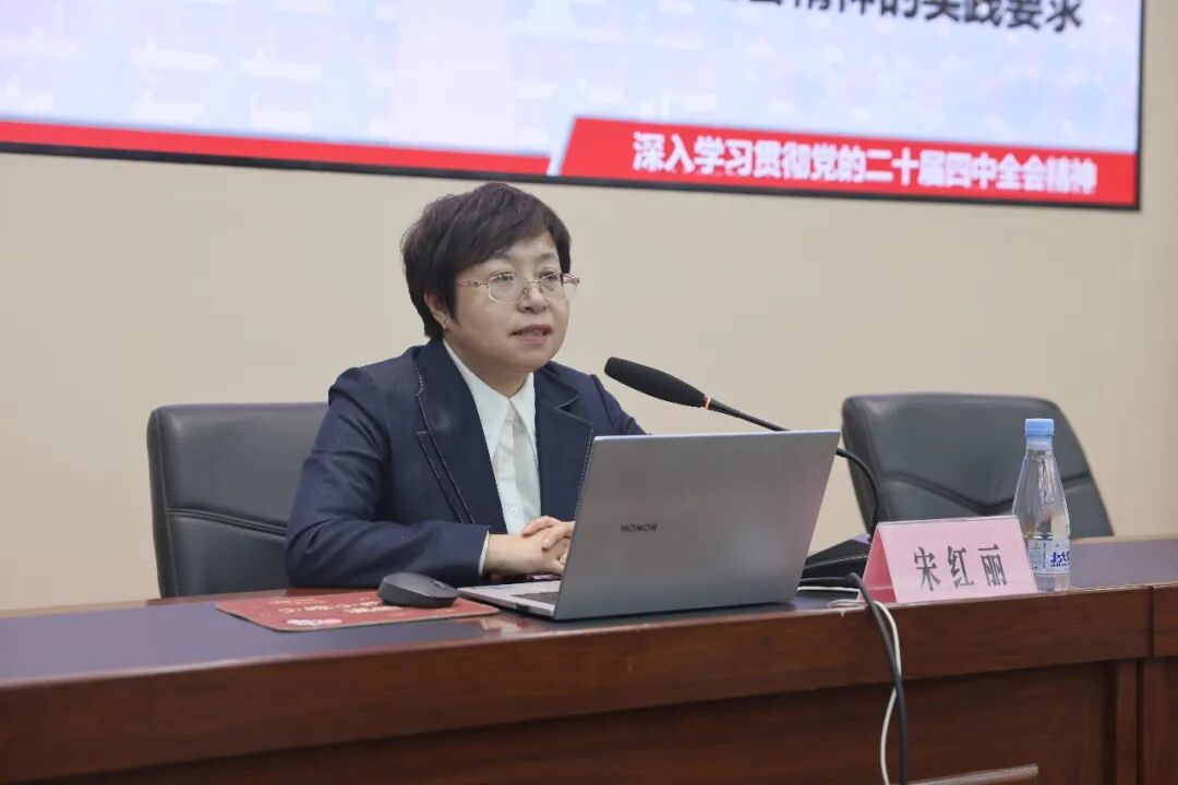 宋红丽教授围绕党的二十届四中全会的重大历史意义、核心精神要义及实践要求展开系统阐释。她结合全会审议通过的《中共中央关于制定国民经济和社会发展第十五个五年规划的建议》,全面回顾了"十四五"时期我国发展取得的重大成就,深入解读了"十五五"时期经济社会发展的历史方位、指导方针和主要目标,并聚焦核心要求,结合北大荒集团在现代化大农业、智慧农业建设等领域的实践经验,对全会精神进行了具象化解读。针对高校使命担当,宋红丽指出,要把学习贯彻全会精神与落实立德树人根本任务相结合,推动教育链、人才链与产业链、创新链深度对接,为推进中国式现代化培育更多高素质人才。