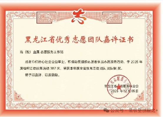 近日,我校创服中心直属志愿服务工作站凭借扎实的服务成效、创新的实践模式与显著的育人成果,荣获“黑龙江省优秀志愿团队银奖”,这是黑龙江省志愿服务合会对我校创新创业学院社会服务工作的高度认可,也是“创公益”行动计划落地见效的标志性成果。创服中心志愿服务平台聚焦双创育人,将志愿服务与创新实践、社会责任深度融合,过去一年,平台累计发布志愿服务活动382次,吸引3000余人次参与,总服务时长突破1.9万小时,以实际行动在校园内外传递农垦学子的温暖担当与创新活力。