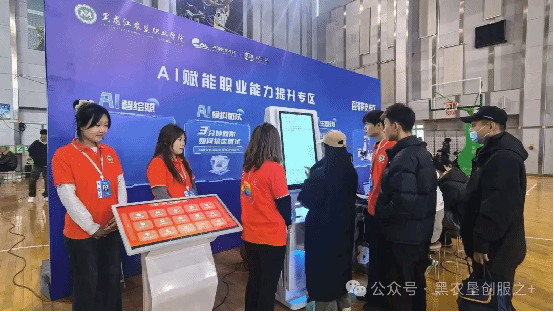 依托“优嘉圈”校园公益服务平台与“黑农垦创服之+”公众号,创服中心构建了数智化志愿服务管理体系,实现活动发布、志愿者招募、资源共享的全流程线上同步。在中华职业教育创新创业大赛、“青领杯”创新创业大赛等省级重要赛事及学校生涯体验周等品牌活动中,累计招募400余名志愿者参与现场保障,以专业的服务助力活动圆满举办。凭借出色的组织协调能力,学校获评两项优秀组织奖。在学校招聘会的AI数字指导专区引导学生运用软件修改简历、模拟面试等,让志愿者在实践中运用数智化功能,锻炼沟通表达、团队协作等综合能力,实现了“服务他人、成长自我”的双重目标。