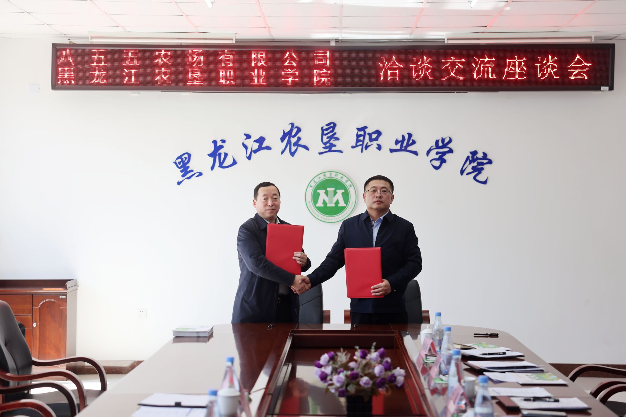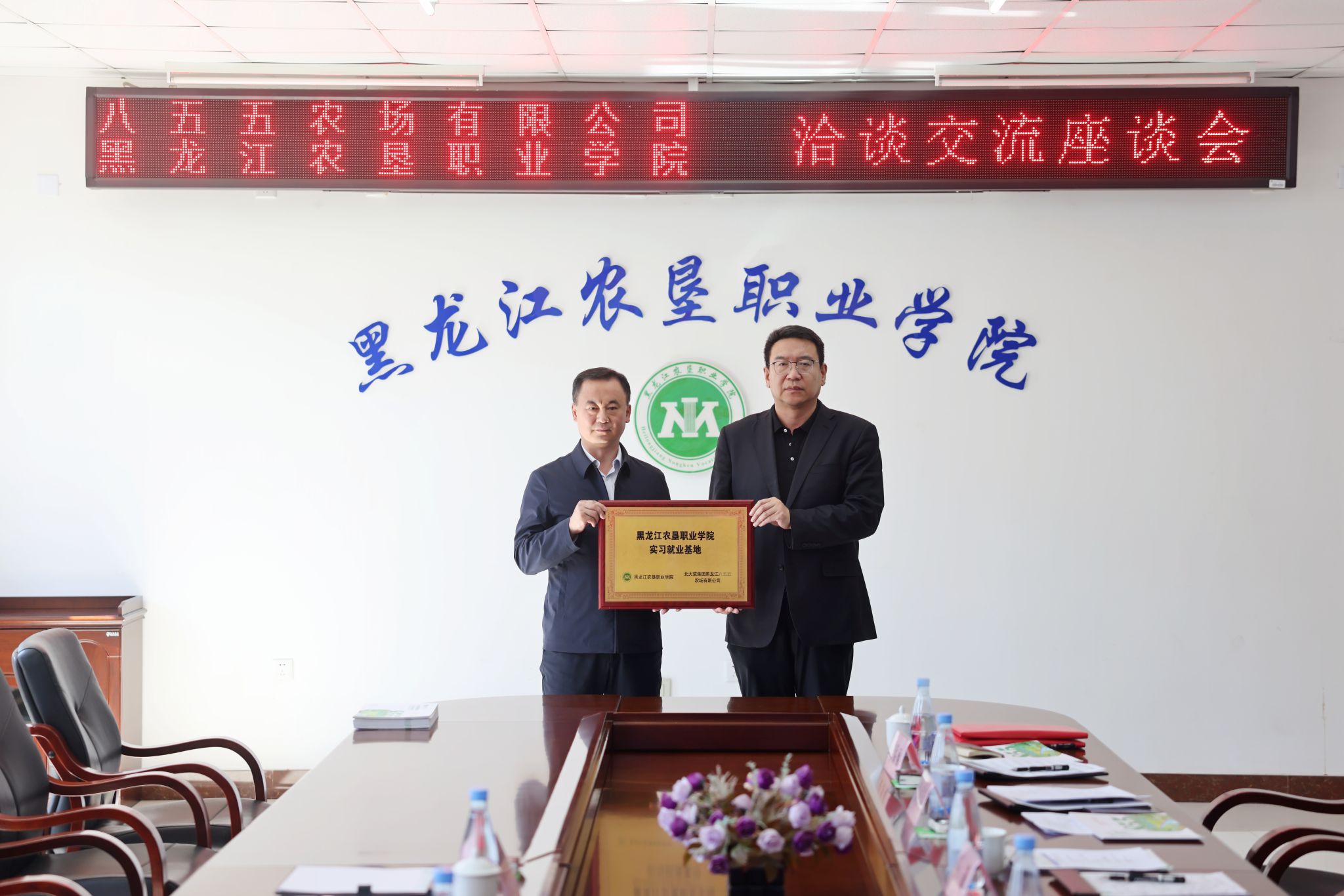 张学勇详细介绍了八五五农场在农业标准化生产、智慧农业建设、良种繁育、粮食贸易、林下经济等方面的发展情况。他表示,农场获评 “中国大豆之乡”“金豆王”称号,高度重视产教融合与人才队伍建设,将充分发挥基地资源与产业优势,为学校提供高水平实践实训平台。农场将秉持“培养、共建、赋能、发展”的合作原则,与学校在人才培养、技术协同、课程共建、标准制定、直播电商等方面开展务实合作,推动学生成长与职工发展同频共振、项目共建与成果转化同向发力。