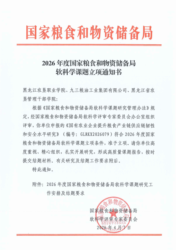 近日,2026年度国家粮食和物资储备局软科学课题立项名单正式公布,由我校与九三粮油工业集团有限公司、黑龙江省农垦管理干部学院联合申报,副校长孟强博士主持的《国有农业企业提升粮食产业链供应链韧性和安全水平研究》(课题编号:GLRKX2026079)成功获批立项,该课题也是北大荒粮食安全研究院成立以来获批的首个省部级科研项目。