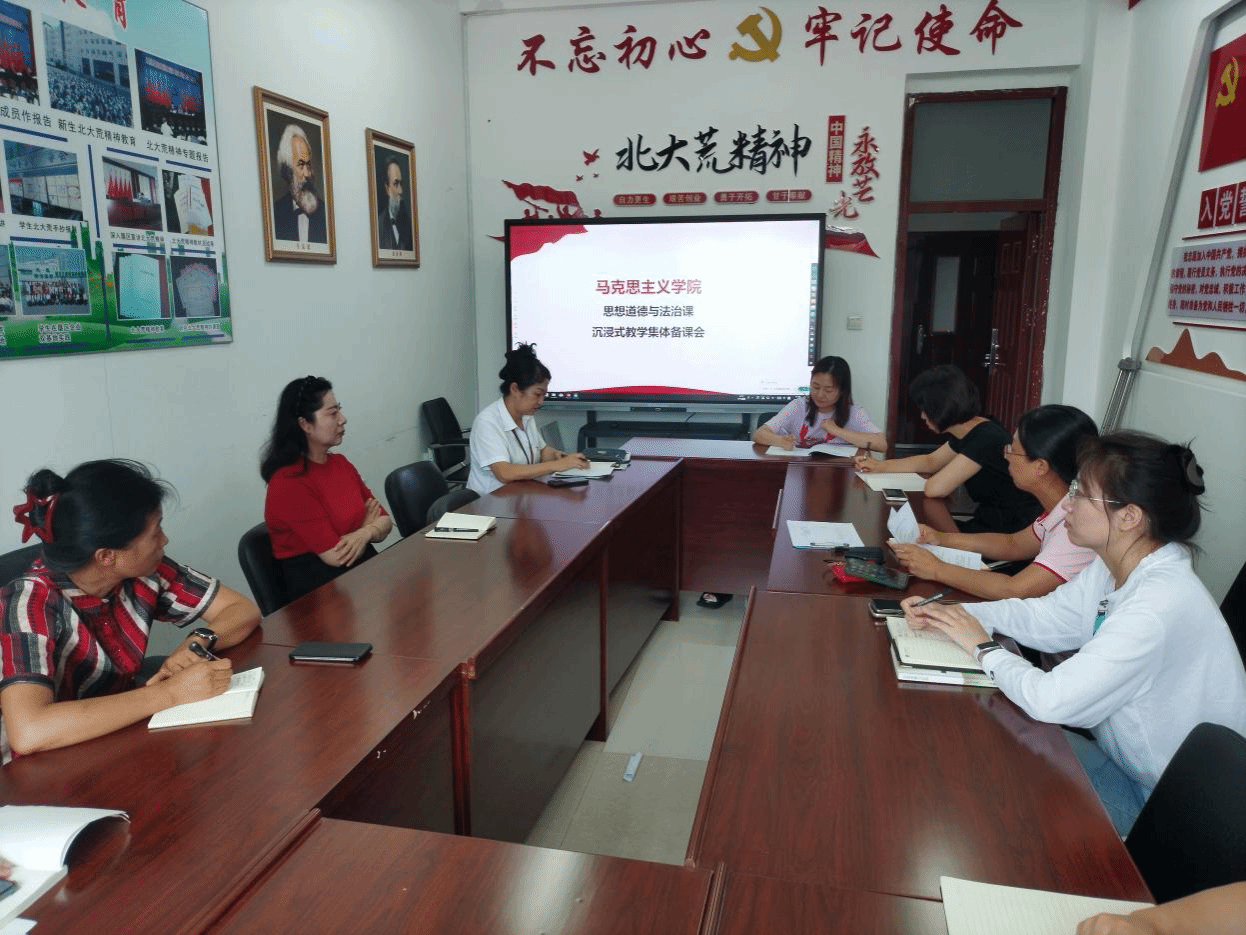 9月1日下午,马克思主义学院在会议室举行“德法课沉浸式教学模式”第一次集体备课汇报会。会上,马院全体教师对老师汇报的《担当复兴大任 成就时代新人》《高尚的人生追求》沉浸式教学设计进行“解剖麻雀式”点评,并现场提出升级版解决方案。此举标志着马克思主义学院以“金课”建设为抓手的思政课全方位改革正式按下“快进键”。