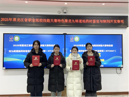 12月13日,黑龙江省职业院校技能大赛特色赛项“龙九味道地药材鉴定与制剂开发”在黑龙江农业工程职业学院圆满落幕。此次大赛汇聚了全省众多高等职业院校的精英选手,经过一天的激烈比拼,学院24级中药制药专业学生姜亚靖、陈彦蕊、刘雨彤、刘思宇4名学生在李郑军、史红波两位老师的悉心指导下,凭借扎实的专业知识和出色的表现荣获三等奖。